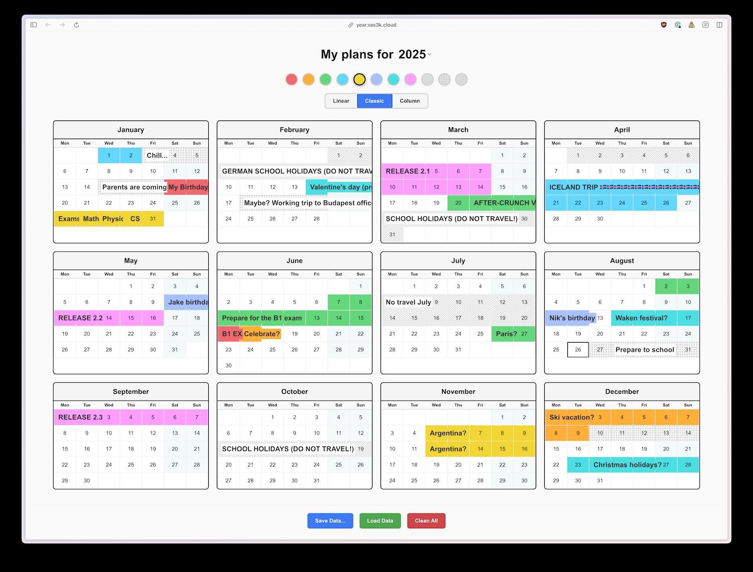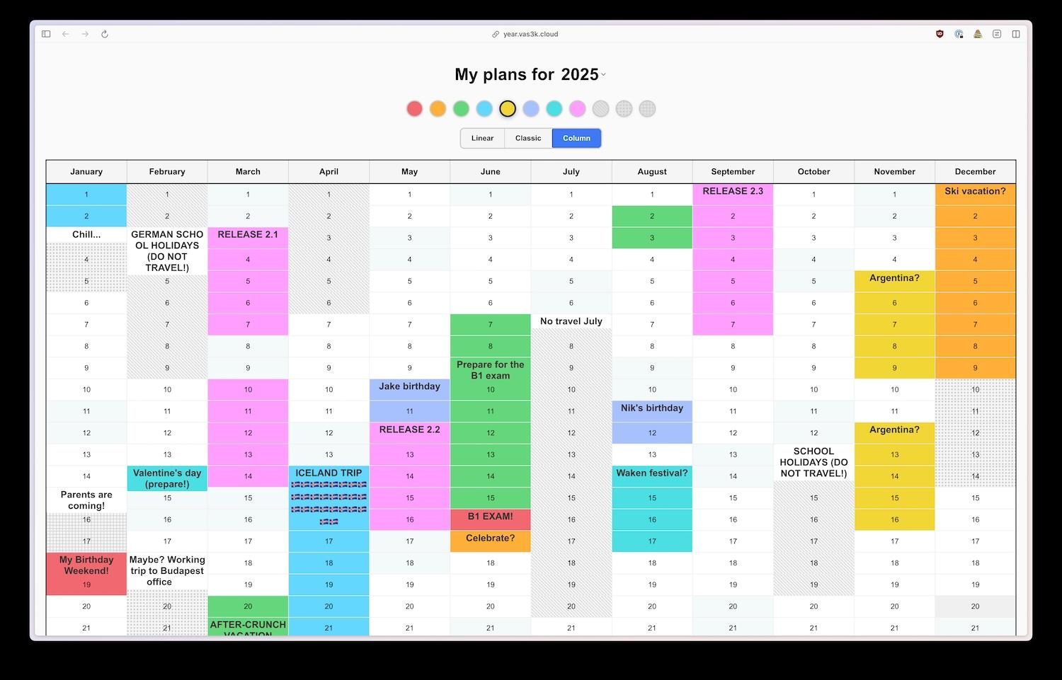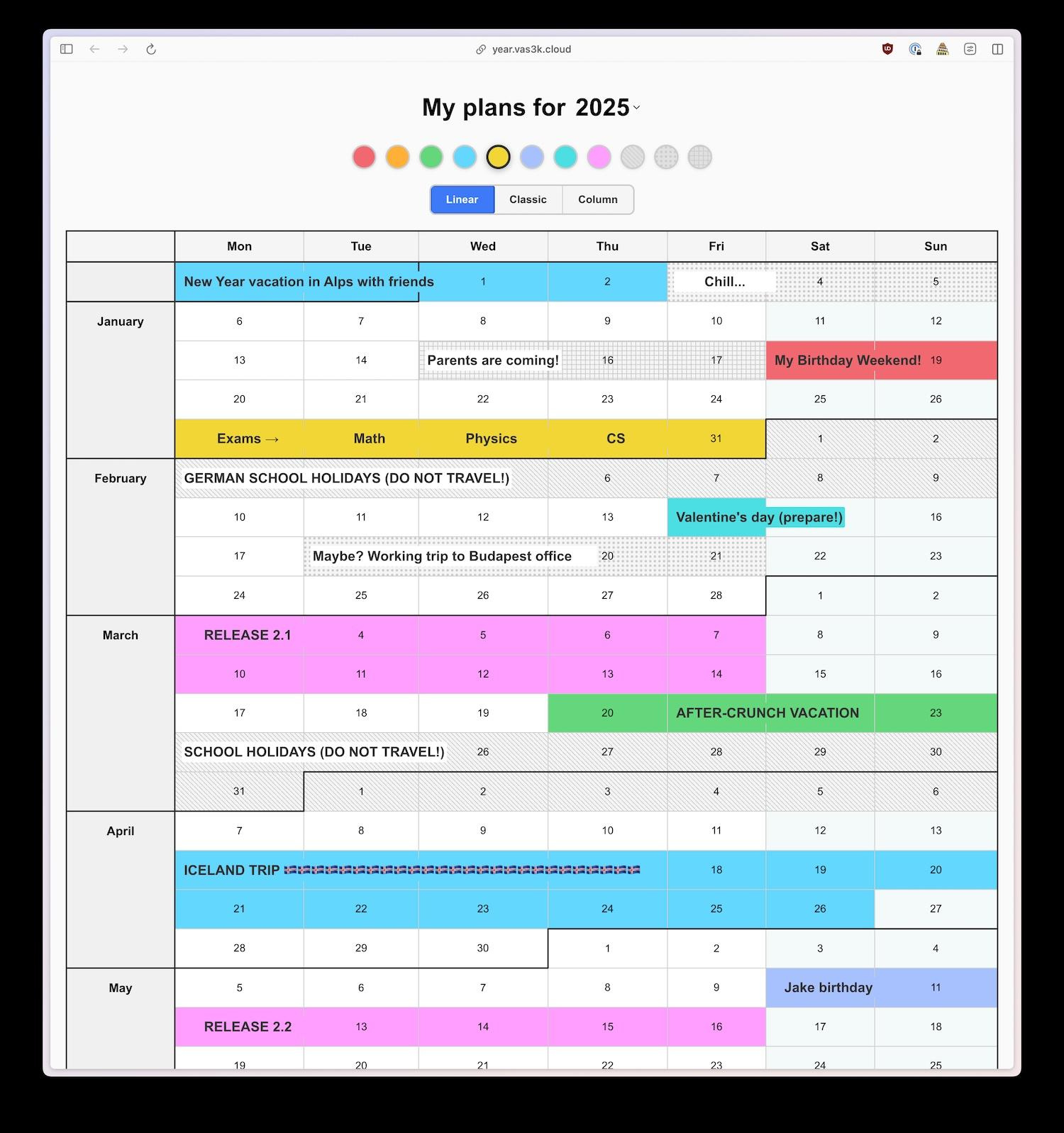 Идея была в том, чтобы иметь некий план года «с высоты птичьего полета» — тут мы отмечаем новый год, тут важные дни рождения, тут в феврале мы едем с друзьями на сноубордах, тут фестиваль, тут конференция, тут Вастрик Кэмп, плюс надо заложить эктра дни на подготовку и отдых.