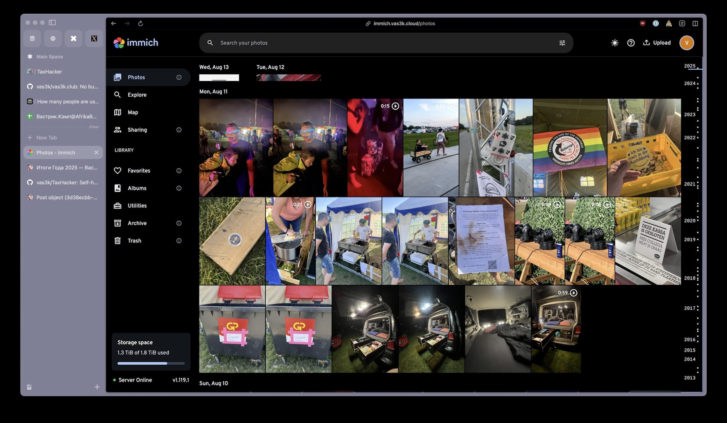 Так вот Immich в этом году стал не только нашим личным домашним облаком для дополнительного бекапа фоточек, но и незаменимым инстрементом для Вастрик Ивентов! Под каждый Кэмп и Флот мы теперь заводим отдельный инстанс Immich'а, куда все участники потом загружают свои фотки и видео в общий альбом.